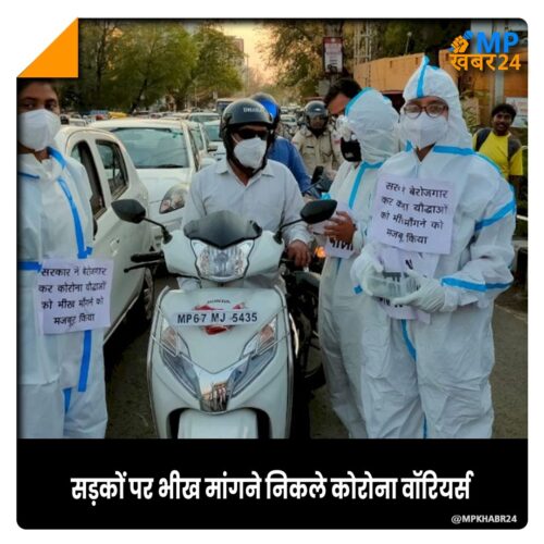 राजधानी भोपाल में सिग्नल पर गाडियां खड़ी होते ही पीपीई किट में एनएचएम द्वारा हटाए गए अस्थाई कोरोना योद्धा कटोरा लेकर भीख मांगने पहुंच जाते हैं। वाहन चालकों को निष्कासित हेल्थवर्कर्स यह बता रहे हैं कि भीषण संक्रमण के दौर में अपनी और परिवार की जान की परवाह छोड़कर सेवाएं देने वाले स्वास्थ्य कर्मियों को अब बाहर कर दिया गया है। इससे दस हजार परिवार प्रभावित हुए हैं।