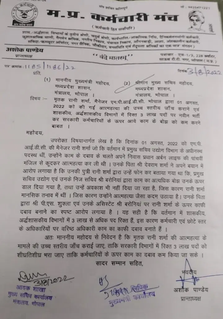 मप्र कर्मचारी मंच के प्रदेश अध्यक्ष अशोक पाण्डेय ने मुख्यमंत्री शिवराज सिंह को पत्र लिखकर रानी शर्मा आत्महत्या मामले की उच्च स्तरीय जांच का निवेदन किया है। पत्र में कर्मचारी नेता ने लिखा कि रानी शर्मा प्रमुख सचिव उद्योग विभाग के अधीनस्थ एमपीआईडीसी में मैनेजर थी उन्होंने काम के बोझ के दबाव के कारण आत्महत्या कर ली।