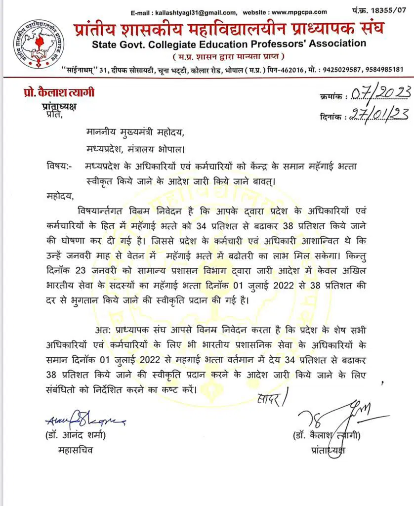 संघ ने अपने पत्र में लिखा है कि ‘मुख्यमंत्री द्वारा प्रदेश के अधिकारियों एवं कर्मचारियों के लिए महंगाई भत्ता 34 प्रतिशत से बढ़ाकर 38 प्रतिशत किए जाने की घोषणा कर दी गई है। इसके बाद प्रदेश के कर्मचारी और अधिकारियों को आशा थी कि जनवरी माह से उन्हें महंगाई भत्ते में बढ़ोत्तरी का लाभ मिलेगा। लेकिन 23 जनवरी को सामान्य प्रशासन विभाग ने एक आदेश जारी कर कहा है कि सिर्फ अखिल भारतीय सेवा के सदस्यों का महंगाई भत्ता 1 जुलाई 2022 से 38 प्रतिशत की दर से भुगतान किए जाने की स्वीकृति प्रदान की गई है।’ इसे लेकर उन्होने मांग की है कि प्रदेश के शेष सभी अधिकारियों और कर्मचारियों के लिए भी भारतीय प्रशासनिक सेवा के अधिकारियों के समान उसी दिनांक से महंगाई भत्ता बढ़ाकर दिया जाए। प्रांतीय शासकीय महाविद्यालयीन संघ के प्रांताध्यक्ष डॉ कैलाश त्यागी और महासचिव आनंद शर्मा द्वारा लिखे गए पत्र में सभी को समान रूप से महंगाई भत्ता देने की मांग करते हुए इस बारे में जल्द से जल्द आदेश जारी करने की मांग भी की गई है।
