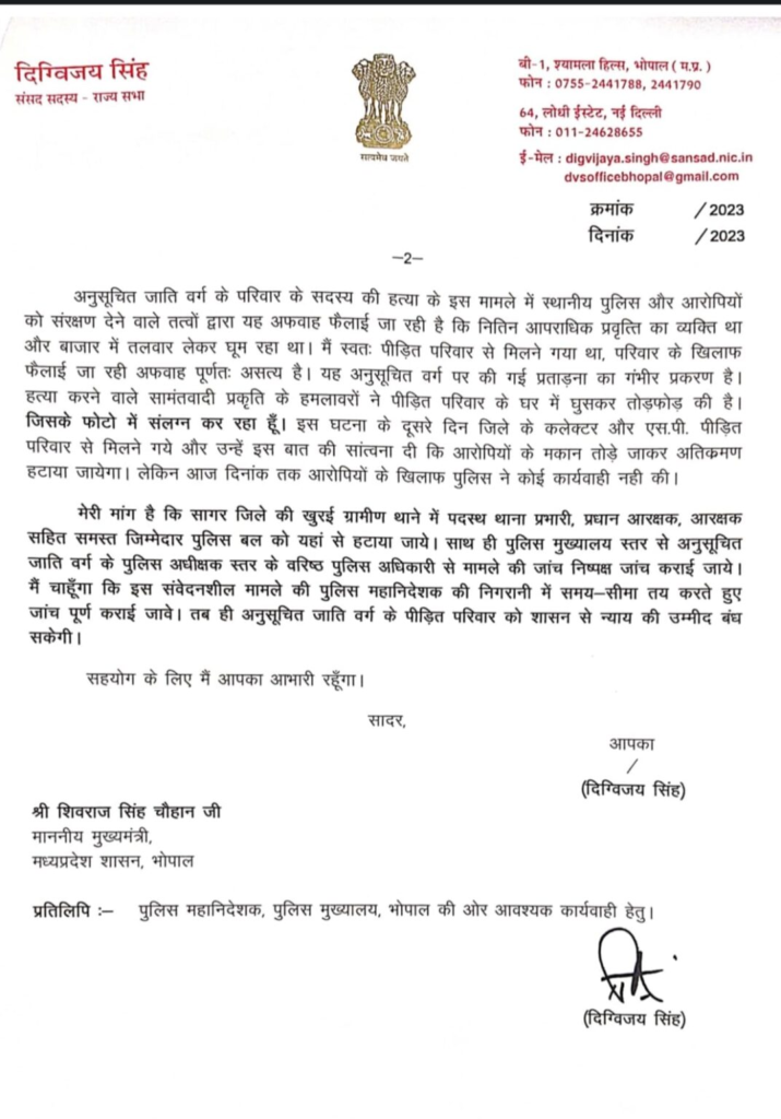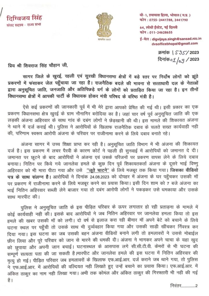 “प्रिय श्री शिवराज सिंह चौहान जी, सागर जिले के खुरई, रहली एवं सुरखी विधानसभा क्षेत्रों में बड़े स्तर पर निर्दोष लोगों को झूठे प्रकरणों में फंसाकर जेल पहुंचाया जा रहा है। राजनैतिक बदले की भावना से सत्ताधारी दल के नेताओं द्वारा अनुसूचित जाति, जनजाति और अतिपिछड़े वर्ग के लोगों को प्रताड़ित किया जा रहा है। इन तीनों विधानसभा क्षेत्रों में आपकी पार्टी के विधायक होकर मंत्री परिषद के वरिष्ठ मंत्री है।