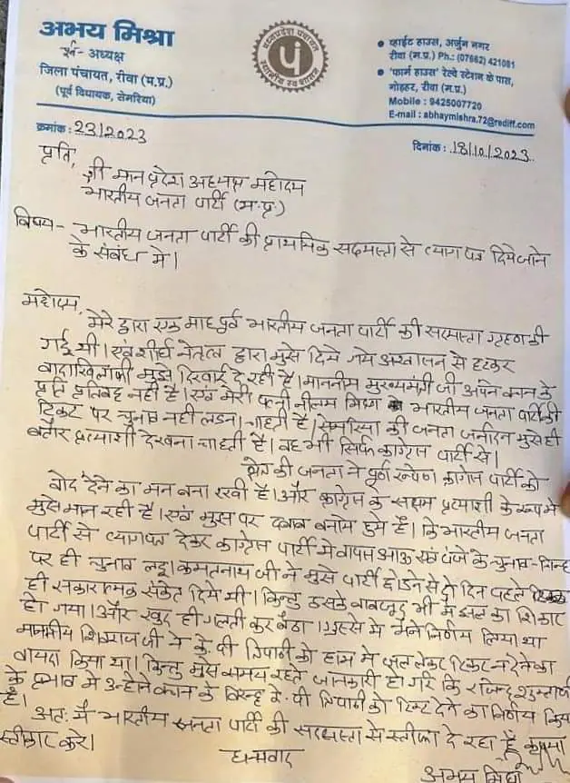जिला पंचायत रीवा के पूर्व अध्यक्ष अभय मिश्रा ने भाजपा से इस्तीफा दे दिया है, उन्होंने प्रदेश अध्यक्ष वीडी शर्मा को अपने लैटर हैड पर अपने हाथ से लिखकर इस्तीफा भेज दिया है, अभय मिश्रा ने पिछले महीने ही भाजपा ज्वाइन की थी, अभय मिश्रा ने इस्तीफे में मुख्यमंत्री शिवराज सिंह चौहान पर वादाखिलाफी के गंभीर आरोप लगाये हैं।