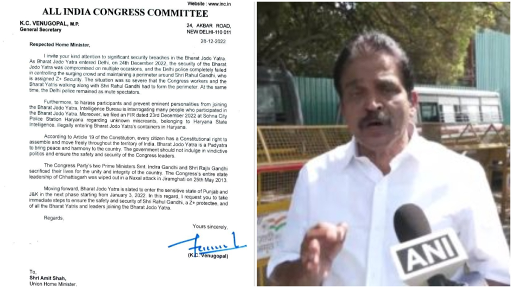 केंद्रीय गृह मंत्री को लिखे पत्र में कहा गया है कि ‘राहुल गांधी को जेड प्लस (Z+ Security) सुरक्षा दी गई है लेकिन इस यात्रा में शामिल लोगों को परेशान करने तथा जानी मानी हस्तियों को यात्रा में शामिल होने से रोकने के उद्देश्य से इंटेलिजेंस ब्यूरो इनसे पूछताछ कर रहा है।’ इसे लेकर पत्र में कांग्रेस द्वारा हरियाणा के गुरुग्राम में की गई पुलिस शिकायत का हवाला भ दिया गया है। इसी के साथ पत्र में लिखा है कि ‘संविधान की धारा 19 के तहत भारत के प्रत्येक नागरिक को देश में कहीं भी घूमने का अधिकार है। भारत जोड़ो यात्रा देश में शांति और सद्भभाव के लिए निकाली जा रही पदयात्रा है। इसे लेकर सरकार को बदले की राजनीति नहीं करनी चाहिए और कांग्रेस नेताओं की सुरक्षा सुनिश्चित करनी चाहिए।’