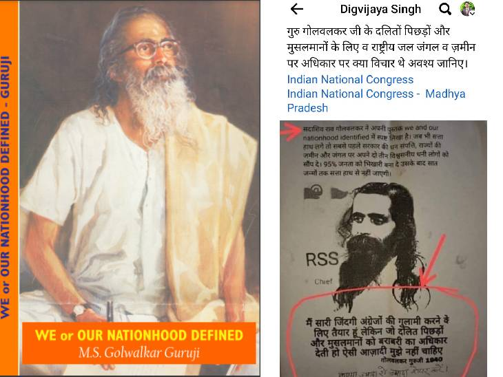 भारतीय जनता पार्टी युवा मोर्चा के पूर्व प्रदेश उपाध्यक्ष अंशुल हरिचरण तिवारी ने कहा कि दिग्विजय सिंह के द्वारा एक कूटरचित पोस्टर डाला गया है जिसमें We and our nation hood identified नामक पुस्तक का हवाला देकर गुरुजी की छवि को धूमिल करने का षडयंत्र किया गया जबकि ऐसी कोई किताब आज तक गुरुजी गोलवलकर द्वारा नहीं लिखी गई और ना ही इस तरह का वाक्य कभी गुरुजी के द्वारा बोला गया ना ही कही इस बात का उल्लेख मिलता है।