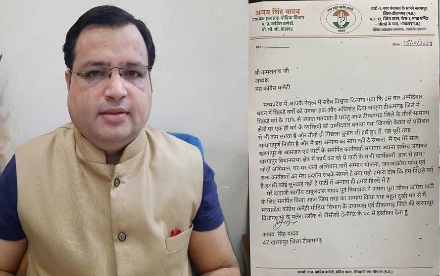 उम्मीदवारों के नाम का ऐलान होते ही एमपी कांग्रेस मीडिया विभाग के उपाध्यक्ष अजय यादव ने पार्टी की प्राथमिक सदस्यता से इस्तीफा दे दिया है। उन्होंने पीसीसी चीफ कमलनाथ को पत्र भी लिखा है और पिछड़ा वर्ग के साथ अन्याय करने का आरोप लगाया है। बताया जा रहा है कि अजय खरगापुर विधानसभा सीट से दावेदारी कर रहे थे, लेकिन यहां से किसी और को टिकट दे दिया गया है, जिससे नाराज होकर यादव ने इस्तीफा दे दिया है।