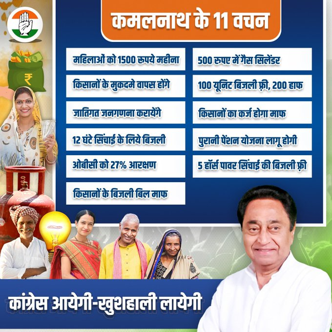आचार संहिता लग चुकी है और चुनावी समर का शंखनाद हो चुका है। राहुल गांधी आज विंध्य आ रहे हैं जहां प्रदेश के सारे बड़े नेता मौजूद रहेंगे। इसी के साथ एक बार फिर कमलनाथ ने जनता को दिए हुए 11 वचन दोहराए हैं। उन्होने ट्वीट करते हुए लिखा है कि “जनता के साथ,11 वचनों की सौगात;