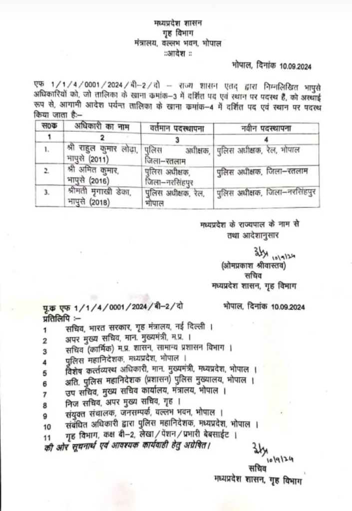 गृह मंत्रालय ने इसी क्रम में तीन IPS अधिकारियों के तबादला आदेश जारी किये हैं। आदेश में रतलाम एसपी, नरसिंहपुर एसपी, एसपी रेल भोपाल के नाम शामिल हैं। शासन ने रतलाम एसपी राहुल कुमार लोढा को एसपी रेल भोपाल नियुक्त किया है जबकि एसपी रेल भोपाल मृगाखी डेका को एसपी नरसिंहपुर बनाया है वहीं एसपी नरसिंहपुर अमित कुमार को एसपी रतलाम पदस्थ किया है।