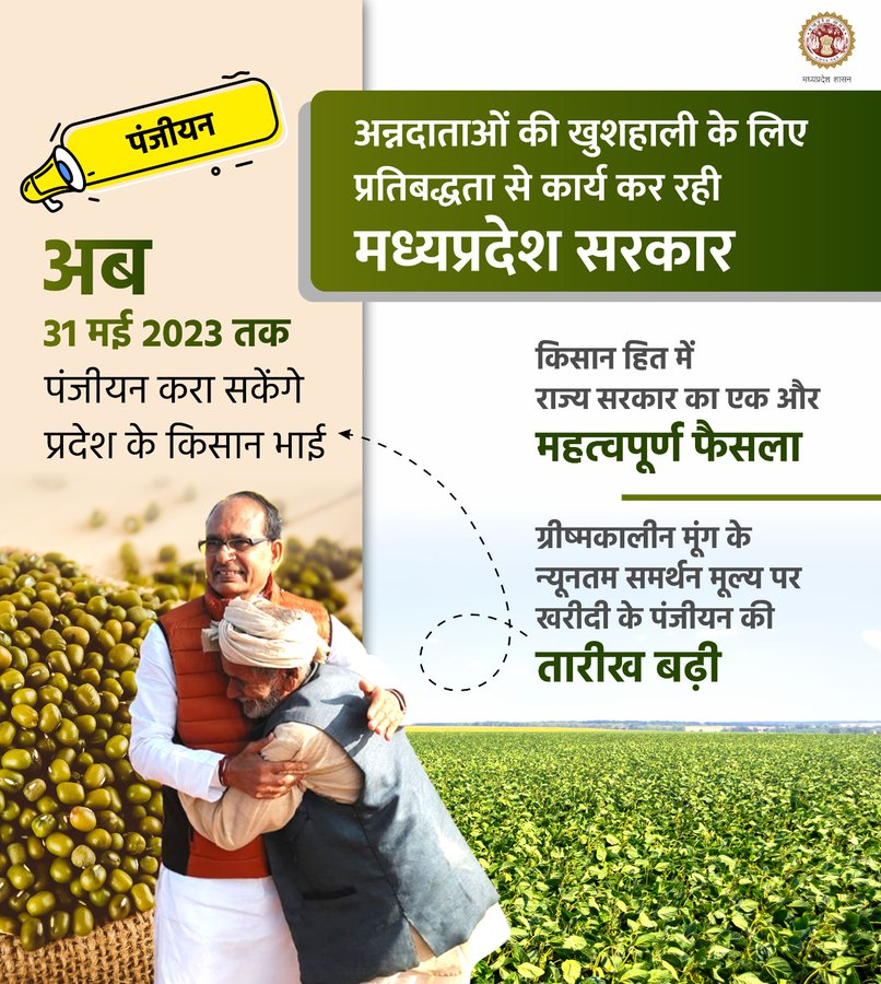 सीएम शिवराज सिंह चौहान ने ट्वीट कर लिखा है कि अन्नदाताओं की खुशहाली के लिए प्रतिबद्धता से कार्य कर रही है मध्यप्रदेश सरकार।किसान हित में राज्य सरकार का महत्वपूर्ण फैसला। किसान भाई अब 31 मई तक कर सकेंगे ग्रीष्मकालीन मूंग के न्यूनतम समर्थन मूल्य पर खरीदी के लिए पंजीयन। किसान भाइयों आपके हित को देखते हुए राज्‍य सरकार द्वारा ग्रीष्‍मकालीन मूंग के न्यूनतम समर्थन मूल्‍य पर खरीदी के पंजीयन की तारीख दिनांक 31.05.2023 तक बढ़ाने का फैसला लिया गया है। विपणन वर्ष 2023-24 में ग्रीष्‍मकालीन मूंग की खरीदी के लिए पंजीयन प्रक्रिया 08 मई से शुरू हो चुकी है।