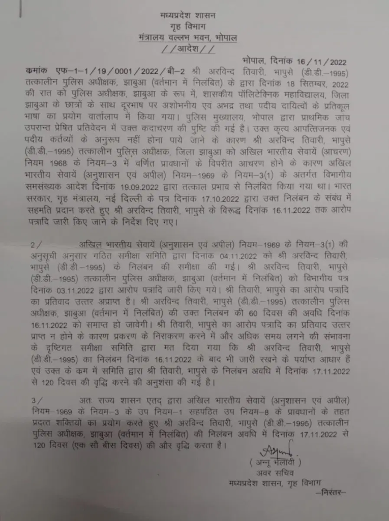 आपको बता दें कि झाबुआ जिले के तत्कालीन एसपी आईपीएस अरविंद तिवारी की ऑडियो क्लिप 18 सितंबर 2022 सोशल मीडिया पर वायरल हुई थी। इसमें वे पॉलिटेक्निक कॉलेज के छात्रों के साथ अभद्र भाषा में बात करते सुनाई दे रहे थे। सोशल मीडिया पर वायरल ऑडियो वरिष्ठ अधिकारियों तक भी पहुंचा और उन्होंने प्राथमिक जांच के बाद एसपी को 19 सितंबर 2022 निलंबित कर दिया।
